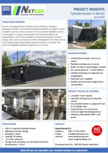 In nauwe samenspraak met de keukenchef en de opdrachtgever werd een complete compacte grootkeuken inclusief opslag, koel, vries en personeel ruimtes samengesteld. De keuze wiel op onze nieuwste generatie NxtGen keukencontainers, waardoor een optimaal mogelijke indeling mogelijk was in 10 units.